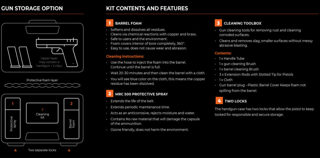 Modern times require compact solutions. I've always had cleaning Kits, but this one tops them all. The Kiro Handgun Cleaning Kit is a "put & forget in a backpack" sized item that is essential for the maintenance of your handgun. Cleaning guns with the range buddies have always been one of my favorite post-range activities, the Kiro handgun cleaning kit comes in handy in this situation as it has multiple brushes and jags for all the buddies and their handguns.The kit is compact, durable, and has enough space for other items such as oils and lubricants.